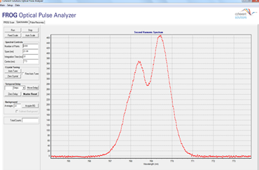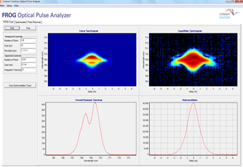 FROG扫描界面。通过这个界面我们就能够观察到脉冲信号的基本信息,如它的光谱曲线图,包络图及FROG光谱图。同时,可以调整FROG扫描参数进行测试优化。通过观察FROG光谱图,我们也可以初步判断测试信号的好坏和一些基本信息。