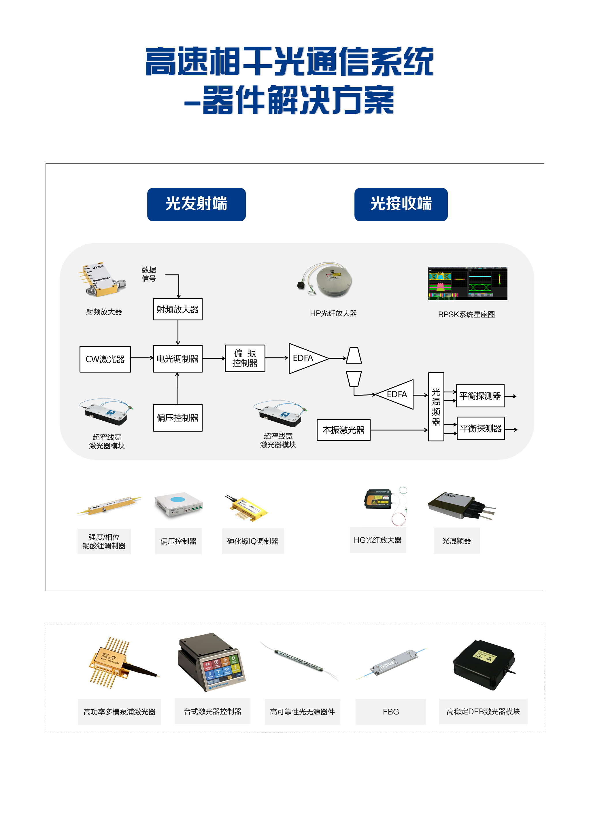 该解决方案由光发射端的窄线宽激光器模块、电光调制器、偏振控制器、光放大器、光混频器、探测器等器件组成。